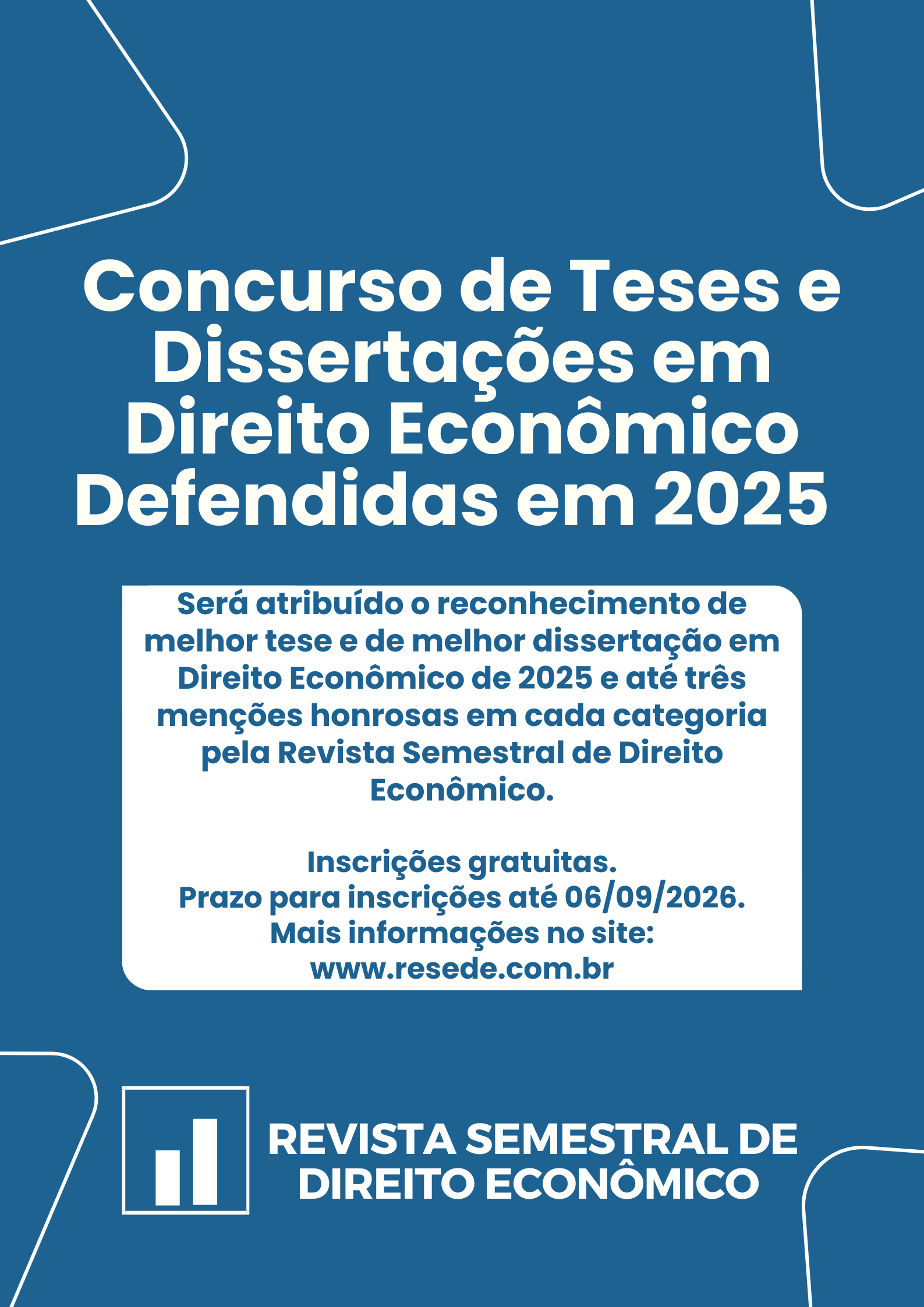 1 Abertura. A Revista Semestral de Direito Econômico torna pública a edição de 2026 do Concurso de Teses e Dissertações em Direito Econômico defendidas e aprovadas no ano de 2025 em Programas de Pós-Graduação reconhecidos pela CAPES.